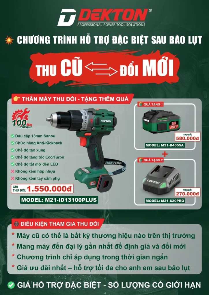 Thời gian vừa qua, nhiều anh em thợ gặp khó khăn khi dụng cụ bị hư hỏng do ảnh hưởng của mưa bão. Hiểu được điều đó, Kết Nối Tiêu Dùng hân hạnh đồng hành cùng Dekton triển khai chương trình hỗ trợ đặc biệt, giúp khách hàng đổi máy cũ lấy máy mới với mức giá siêu rẻ cùng nhiều quà tặng hấp dẫn. Anh em hãy cùng Kết Nối Tiêu Dùng tìm hiểu chi tiết chương trình dưới đây để mang về cho mình những phần quà độc đáo, không thể bỏ lỡ nhé!